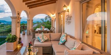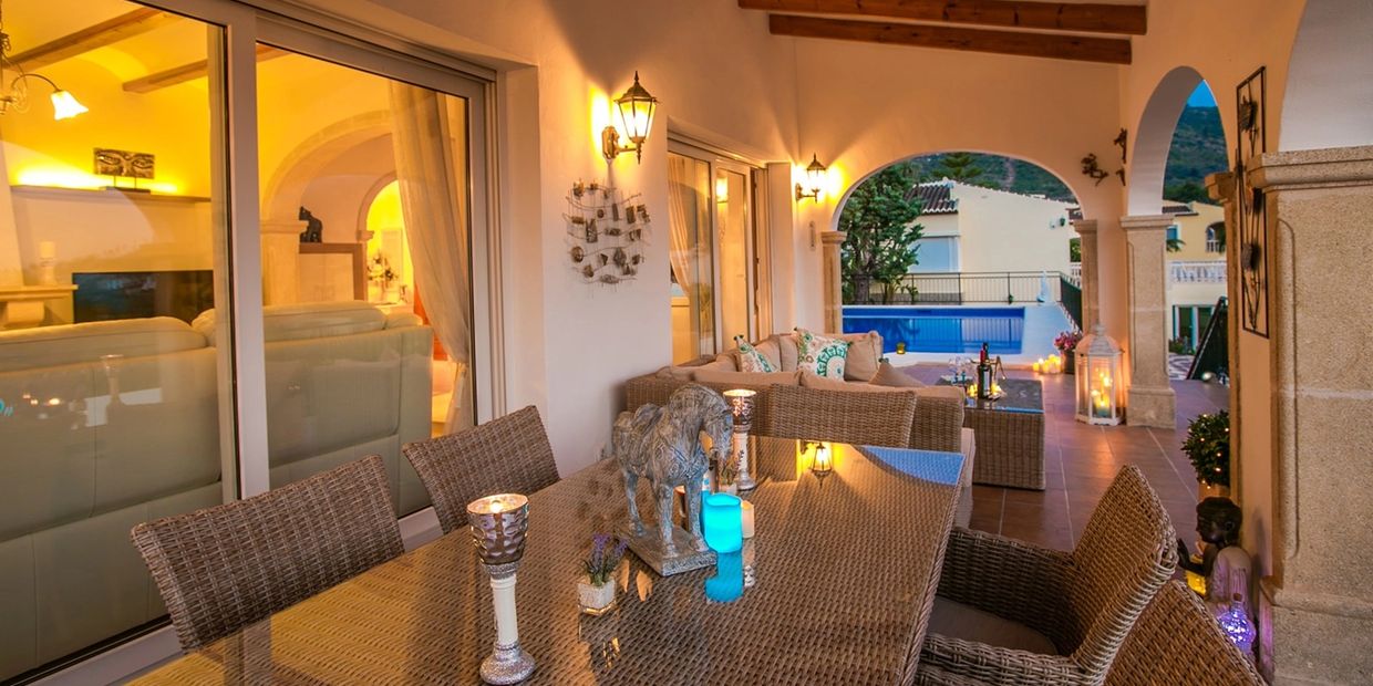 The large covered terrace (also known as a naya in the Alicante region) is south facing and has separate dining and comfortable seating areas. The naya enjoys panoramic mountain views across La Sierra Bernia and the famous 'sleeping elephant' Mount Montgo. The naya is the perfect place for alfresco dining - why not try a romantic candlelit dinner while you watch the sun set slowly against the spectacular mountain backdrop.